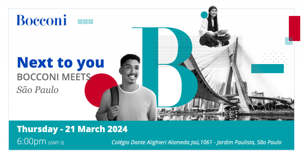 A Universidade Bocconi convida ao evento “Bocconi Meets Brazil”, uma iniciativa na cidade de São Paulo para conhecer a Universidade Bocconi através dos ex-alunos que trabalham em suas respectivas áreas.